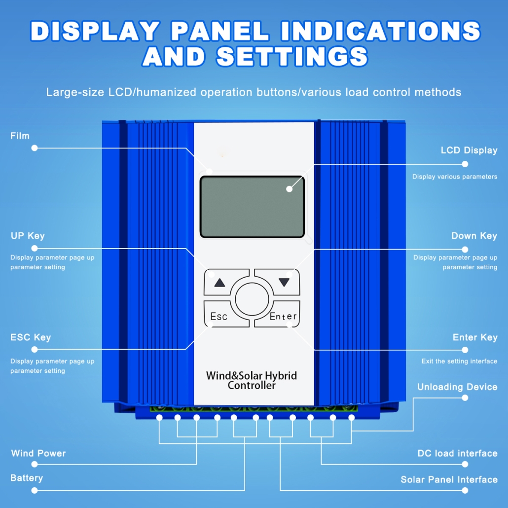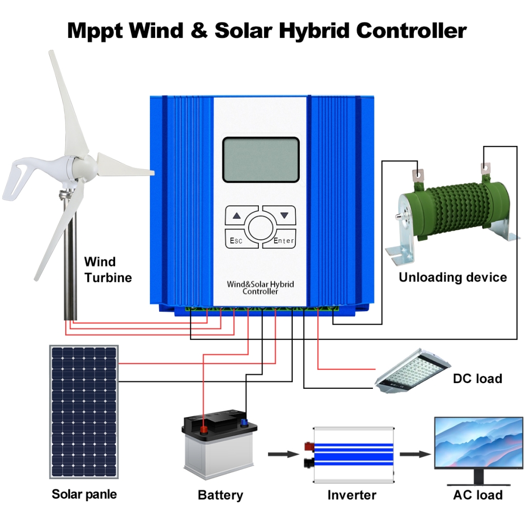 The MAX Series Wind-Solar Hybrid MPPT Controller is a professional all-in-one energy management unit designed to integrate 2000W wind turbines and 400W solar panels into a reliable off-grid or hybrid power system. Equipped with advanced MPPT (Maximum Power Point Tracking) technology, it maximizes energy harvest from both wind and solar sources while providing comprehensive battery protection and stable power delivery. With flexible voltage options (12V/24V AUTO, 48V), a rugged aluminum shell, and an intuitive LCD display with physical buttons, it serves as the core control component for residential off-grid systems, remote telecom sites, and small-scale renewable energy installations.