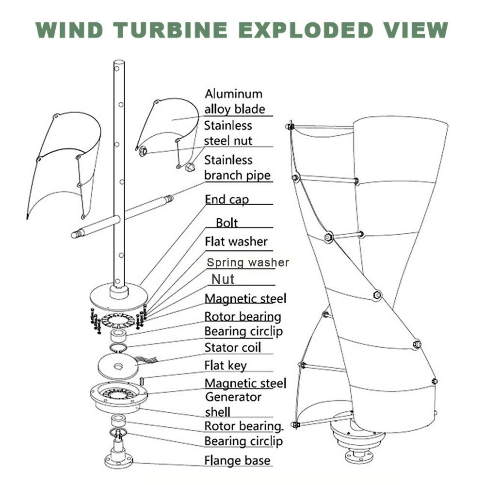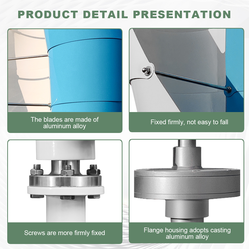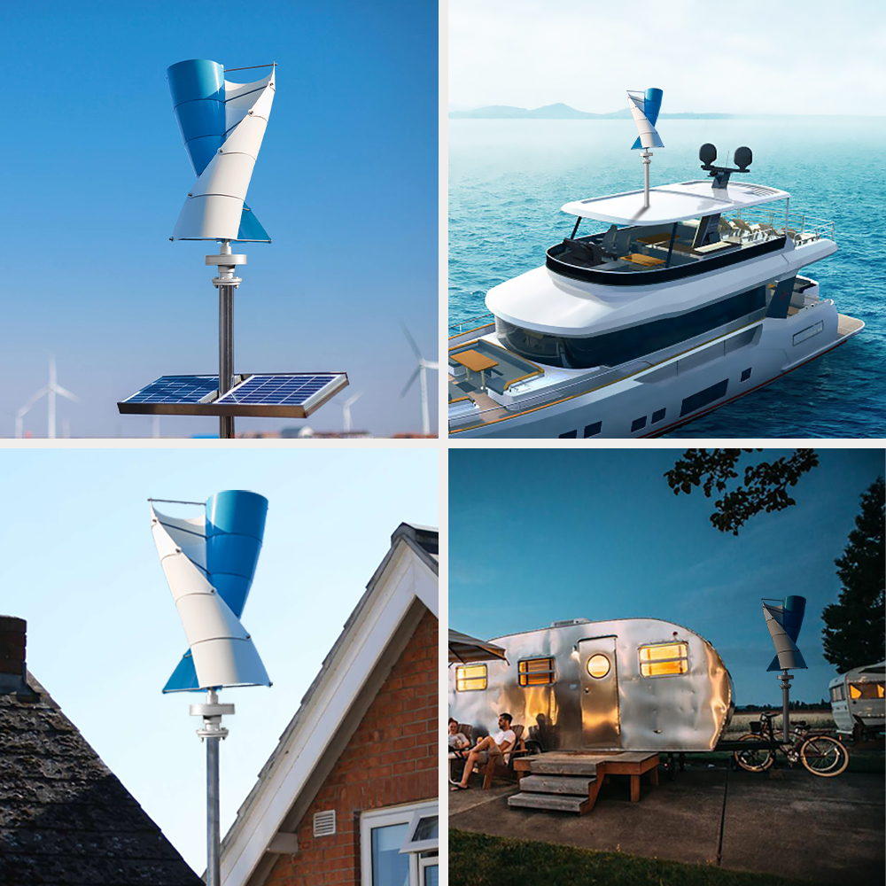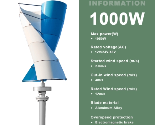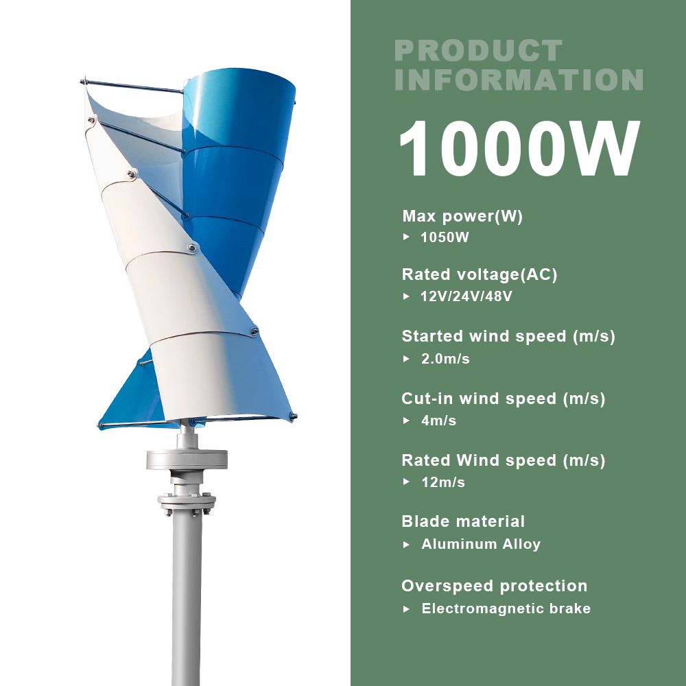 The SJ1000W is a compact, high-performance spiral vertical axis wind turbine designed for residential, off-grid, and hybrid wind-solar systems. With a rated power of 1000W and a maximum power of 1050W, it features a three-phase permanent magnet suspension maglev generator, durable aluminum alloy blades, and an eye-catching blue-white color scheme. Engineered for low noise, high efficiency, and reliable safety protection, it is ideal for home power backup, remote cabins, RVs, boats, and small renewable energy projects.